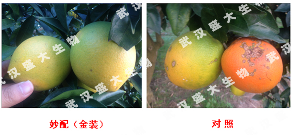 現場我們可以看到比較明顯的區別,臍橙施用“妙配”(金裝),樹勢好、葉色綠,尤其是新葉葉色對比明顯(如圖2);另外,正在轉色的臍橙,可以看 到果實轉色進度較快,并且果皮色澤均勻,而對照還存在青皮、澀果、潰瘍果、早衰果現象,手一碰就會脫落(如圖3、圖4)。