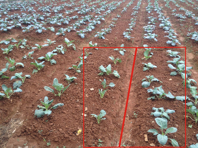 圖一:紅線左側對照,右側營養液沖施7天后效果(第一次)
