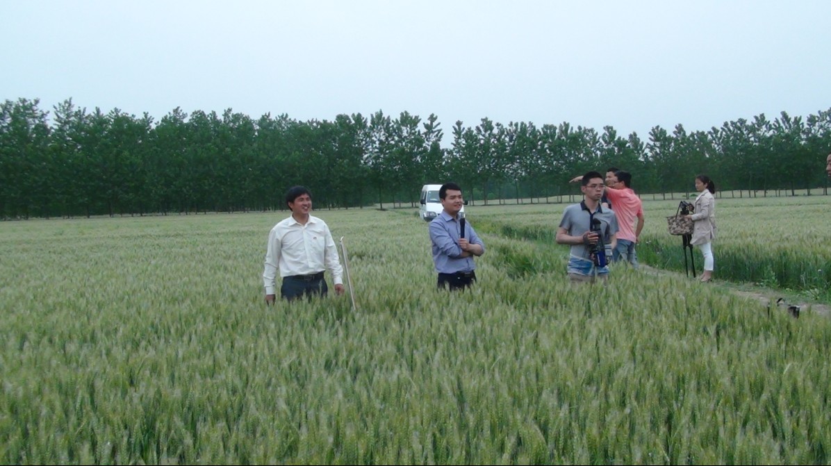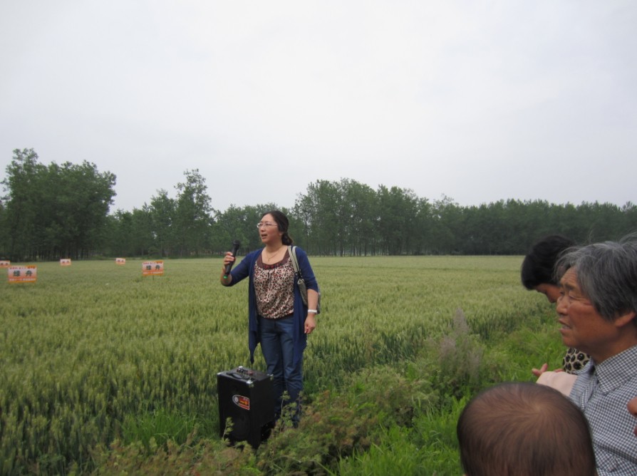 上圖為公司江蘇市場負責人顧永征經理(中)正在為眾人介紹小麥施用綠舟的情況