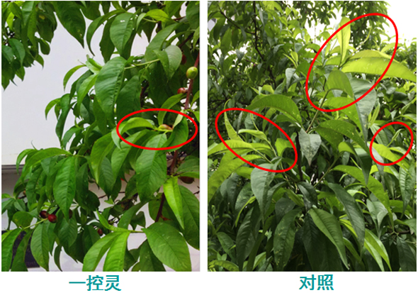 公司研發(fā)部于2016年3月24日開始在桃樹上進(jìn)行試驗,試驗選用一控靈200倍液進(jìn)行噴施,第一次噴施為謝花期,第二次噴施為坐果期。觀察時為第二次噴施后的第7天,已可見對控梢的良好效果。具體的試驗數(shù)據(jù)如下: